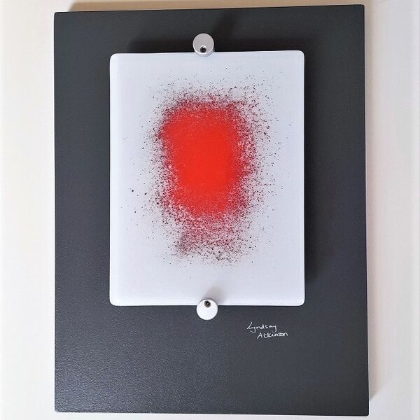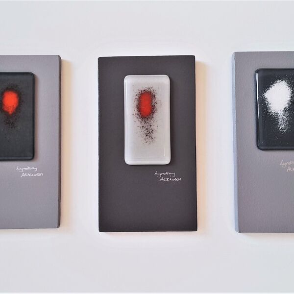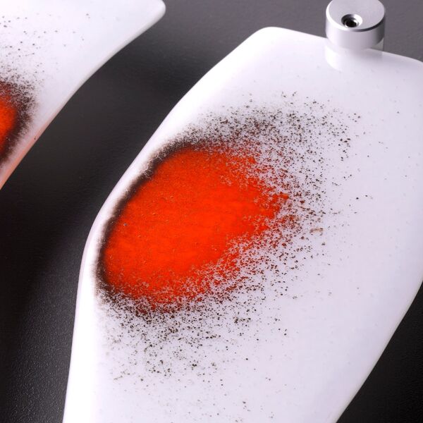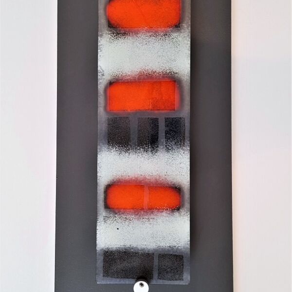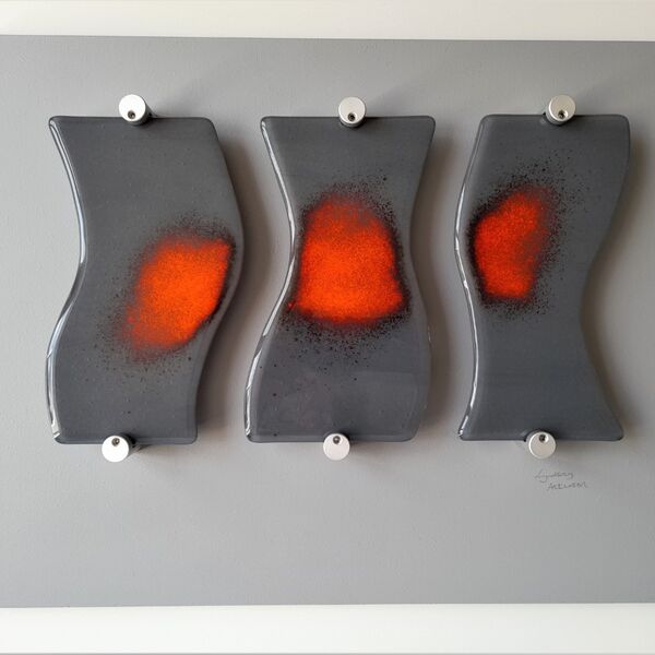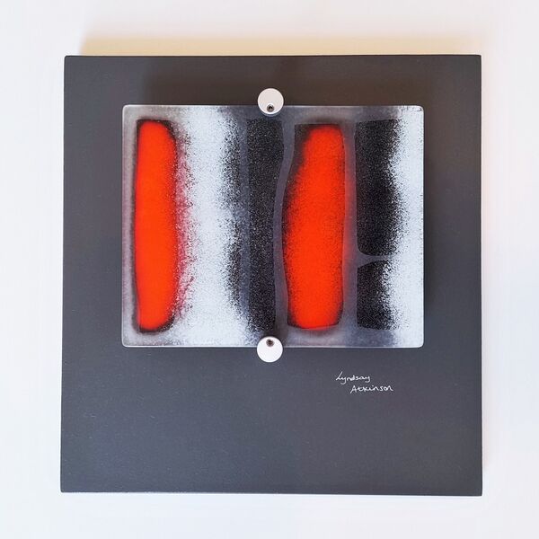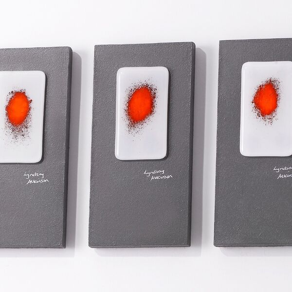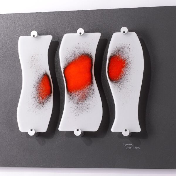 Glass enamel powders are fired on the surface of the glass and capped with a layer of clear glass. I love the way the motion of applying the enamel is captured across the surface during firing in the kiln. As you can see, I particularly like the vibrant orange which creates a burst of intense colour in these panels.
