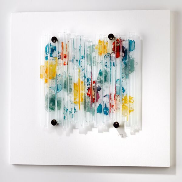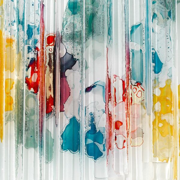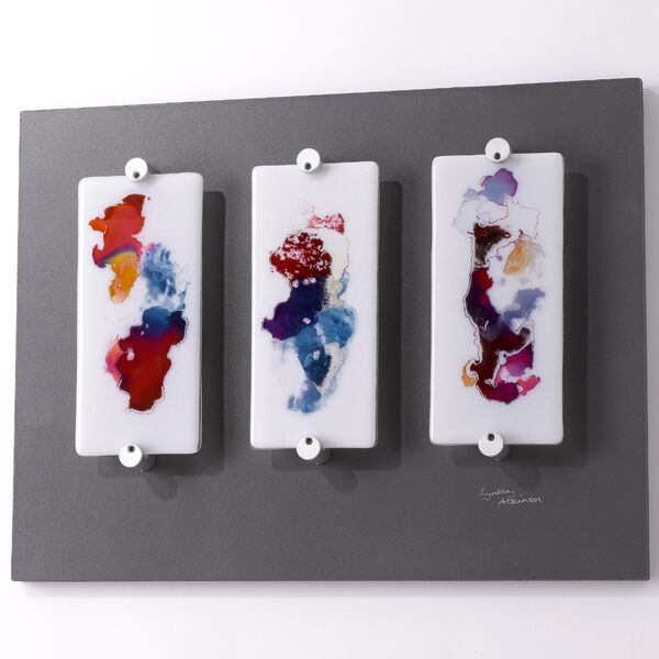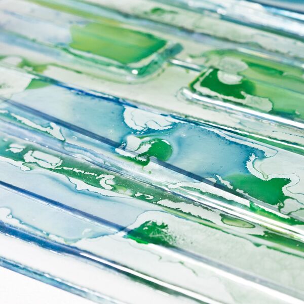 These metallic lustres create a beautiful sheen and iridescence when fired onto glass. I am drawn to their ethereal quality and how they emulate the flow of water across the surface. Lustres are applied on a second firing at a much lower temperature. The surface pattern is delicate and care must be taken not to use glass cleaners or polish the surface.